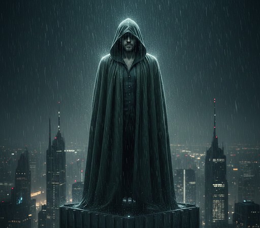 Eu me encontrava em um plano elevado, possivelmente o topo de um edifício colossal, onde o limite entre o asfalto e o céu parecia inexistente. Sob uma chuva persistente que lavava a paisagem cinzenta, eu buscava algo — ou alguém — que não conseguia nomear. Foi nesse cenário de suspensão que a figura surgiu.