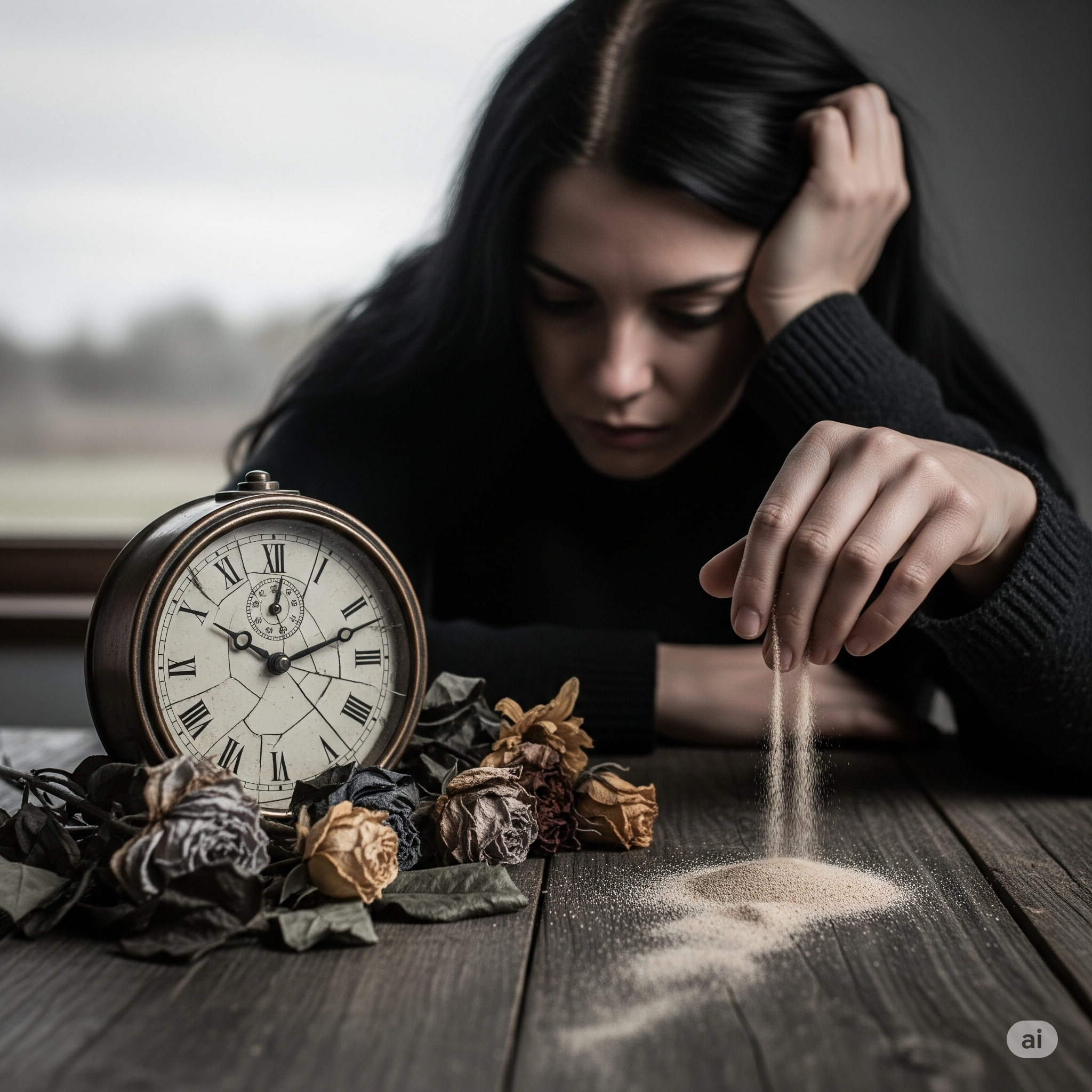 Em uma tarde cinzenta, um relógio parou no momento exato em que o vento sussurrava uma verdade. As paredes, outrora vibrantes, agora absorviam a melancolia de um vazio. As flores, de súbito, perderam a cor, e o canto dos pássaros se tornou um eco distante. Onde antes havia um jardim de palavras, restava apenas o silêncio de uma pedra. O peso do não-dito era o único adorno. E no centro de tudo, uma figura imóvel, observando o tempo dissolver a areia entre seus dedos, entendendo que nem toda tempestade é para ser contida. Algumas são para serem apenas testemunhadas, até que o último grão de areia se vá.